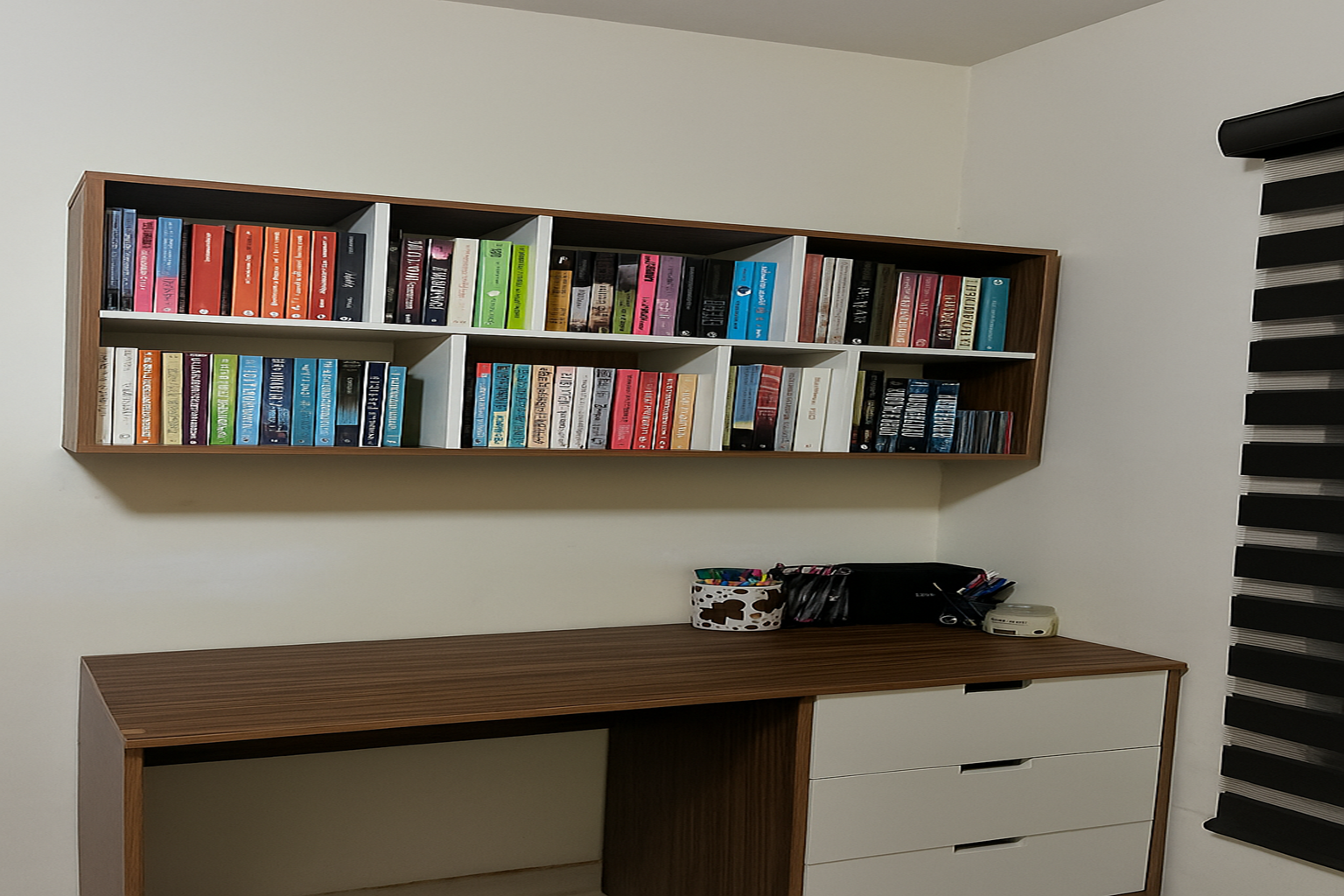 Este mueble modular combina de forma inteligente una cama alta con múltiples funciones, convirtiéndolo en una solución ideal para espacios pequeños. Su diseño moderno y minimalista destaca por el contraste entre el blanco brillante y una madera muy oscura En la parte superior se encuentra la cama tipo loft, mientras que debajo incorpora una zona de trabajo con escritorio y estantes. Además, integra un armario de dos puertas y una cómoda con varios cajones. La estructura incluye una escalera formada por cajones amplios que sirven como almacenamiento adicional, aprovechando al máximo cada espacio.